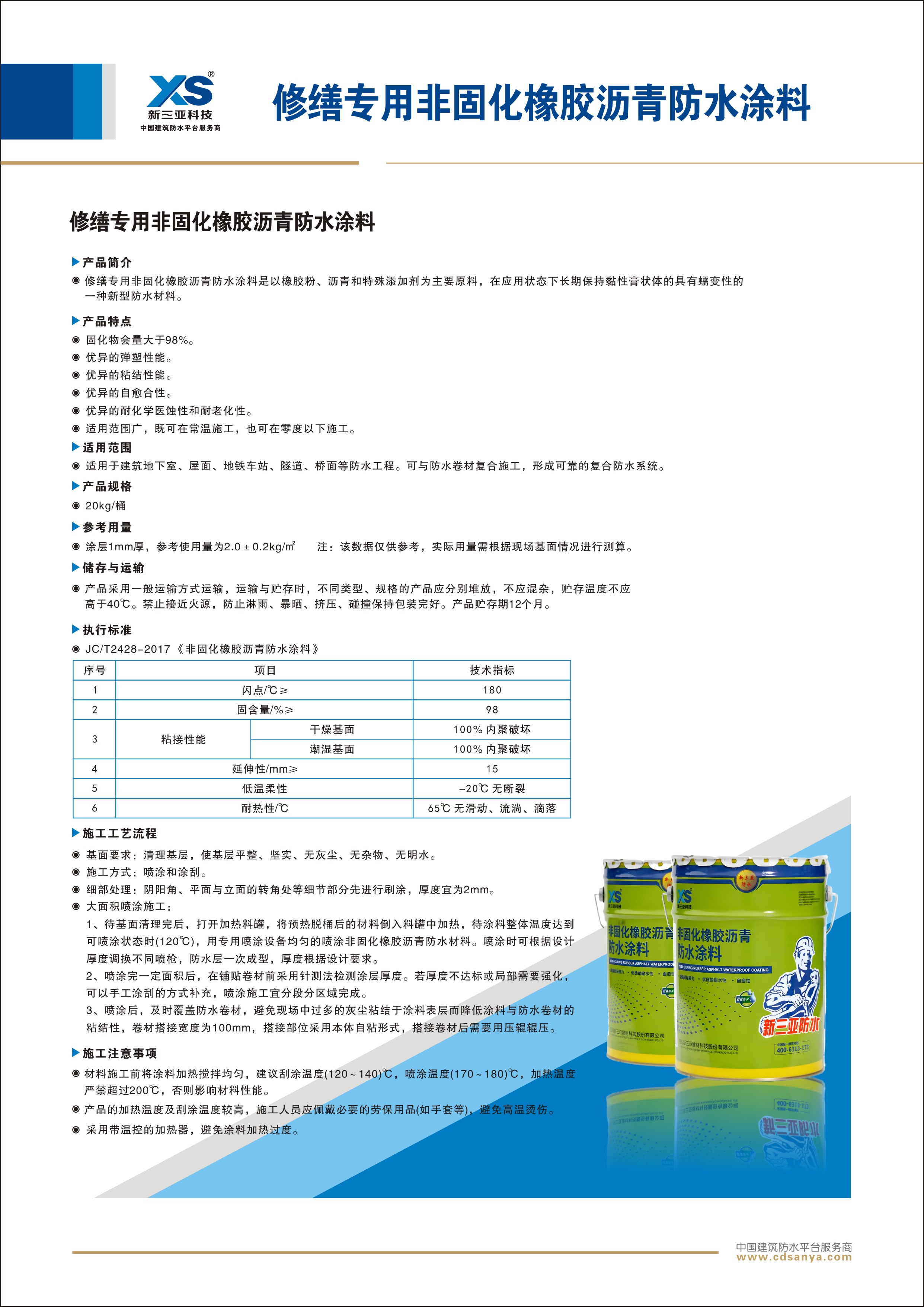 產(chǎn)品特點 1、 固化物會量大于98%; 2、優(yōu)異的彈塑性能; 3、優(yōu)異的粘結(jié)性能; 4、優(yōu)異的自愈合性; 5、優(yōu)異的耐化學(xué)醫(yī)蝕性和耐老化性; 6、適用范圍廣,既可在常溫施工,也可在零度以下施工 | ![]() |